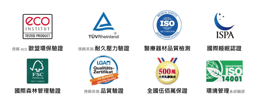迪奧斯 Dios 天然乳膠床墊榮獲多項國際認證,包含德國 ECO及 LGA機構檢驗,認證證實不含氯酚、丁二烯、亞硝胺、甲醛等有毒物質。