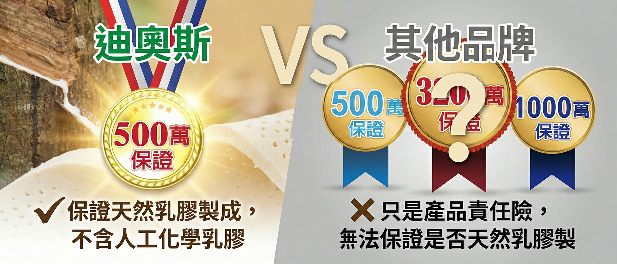 很多消費者誤以為有「產品責任險」就等於買到好產品,這是錯誤的觀念!許多人工化學乳膠廠商利用這點來蒙混過關。迪奧斯 堅持「天然乳膠製成」的真實保證,更立下「若含人工化學乳膠賠償伍百萬」的重誓。選購時請切記:別被保險名詞呼嚨 !