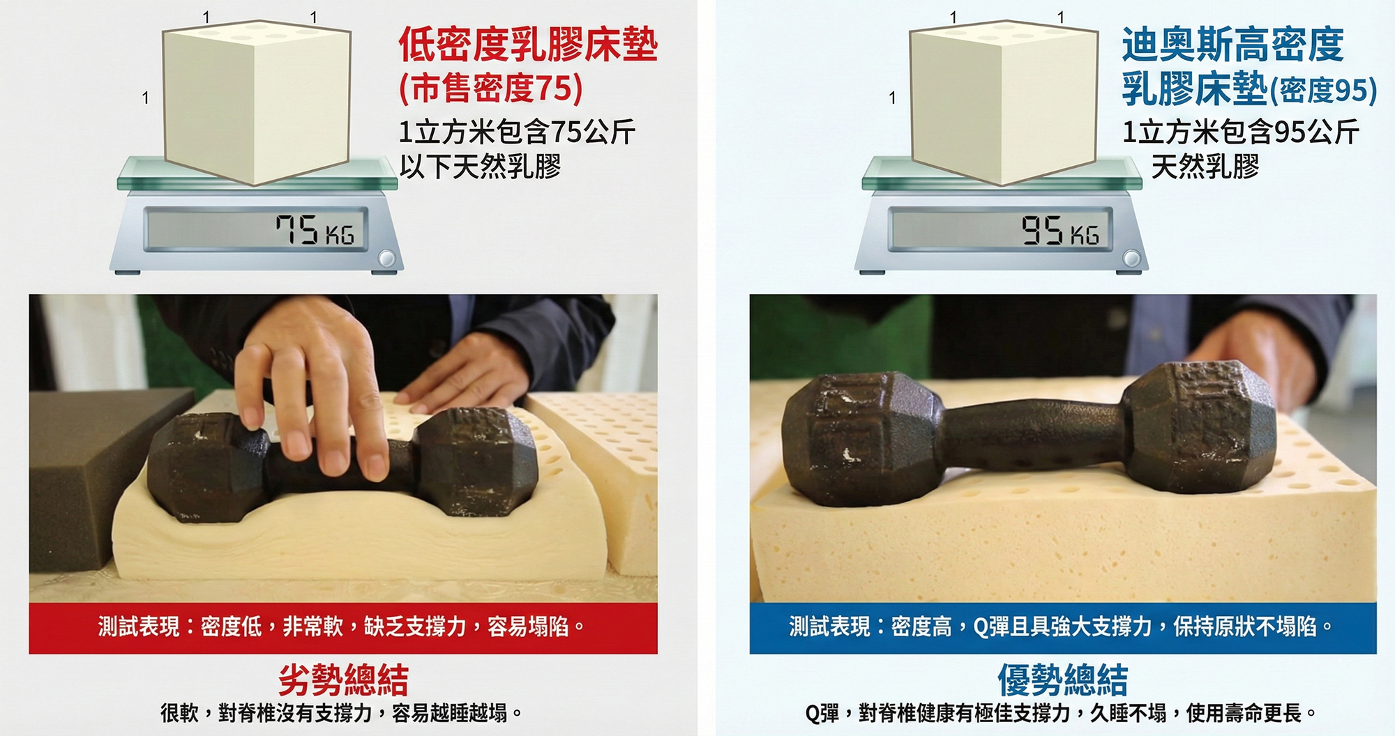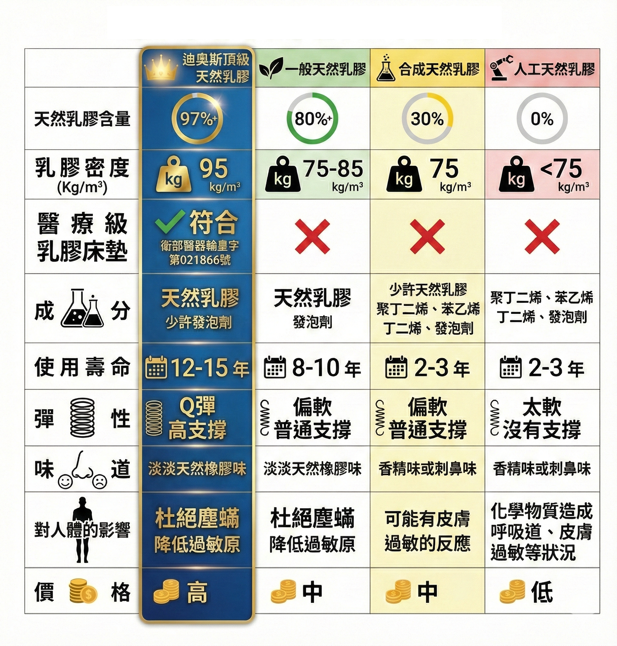 迪奧斯 高密度 (95~110 kg/m³):紮實 Q 彈,支撐性佳,使用壽命可達 10 年以上。